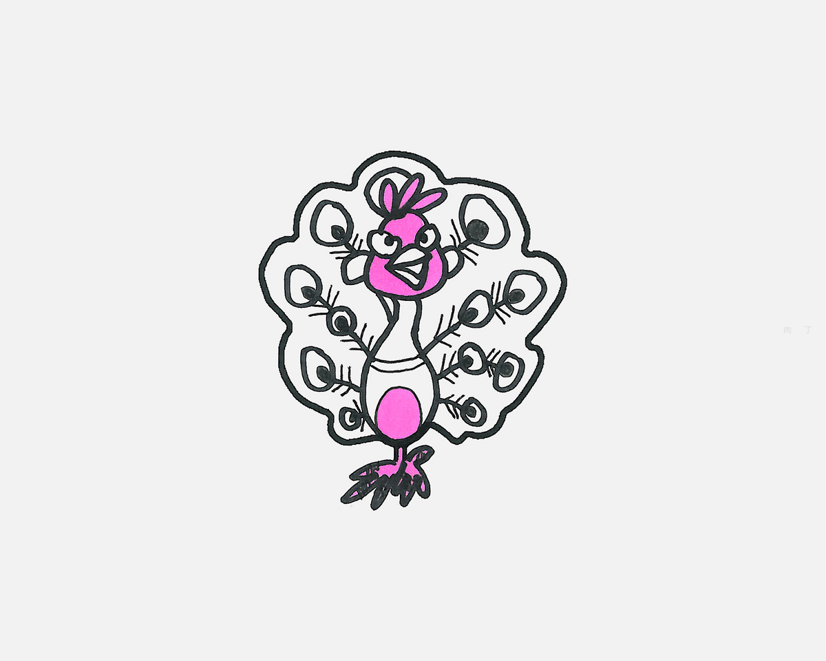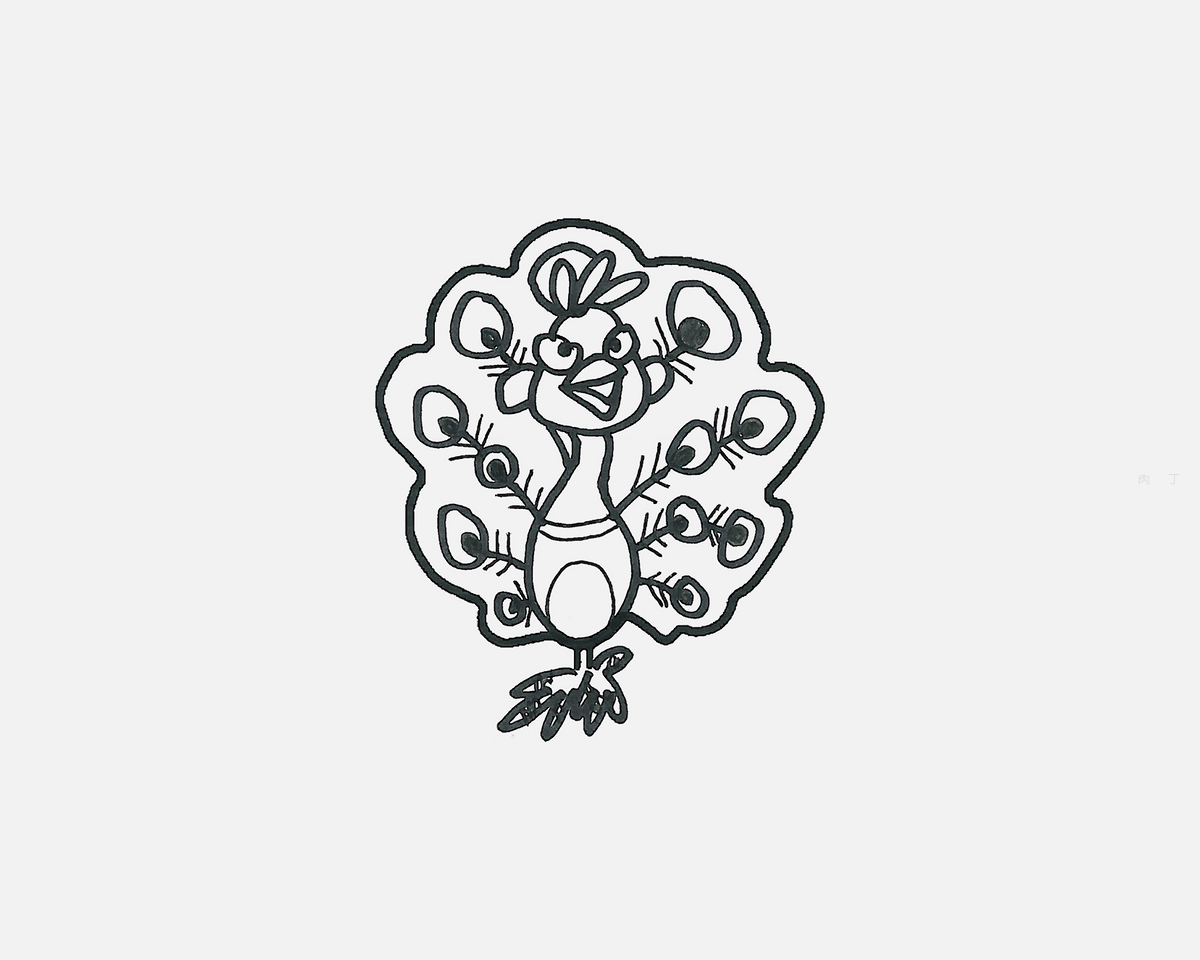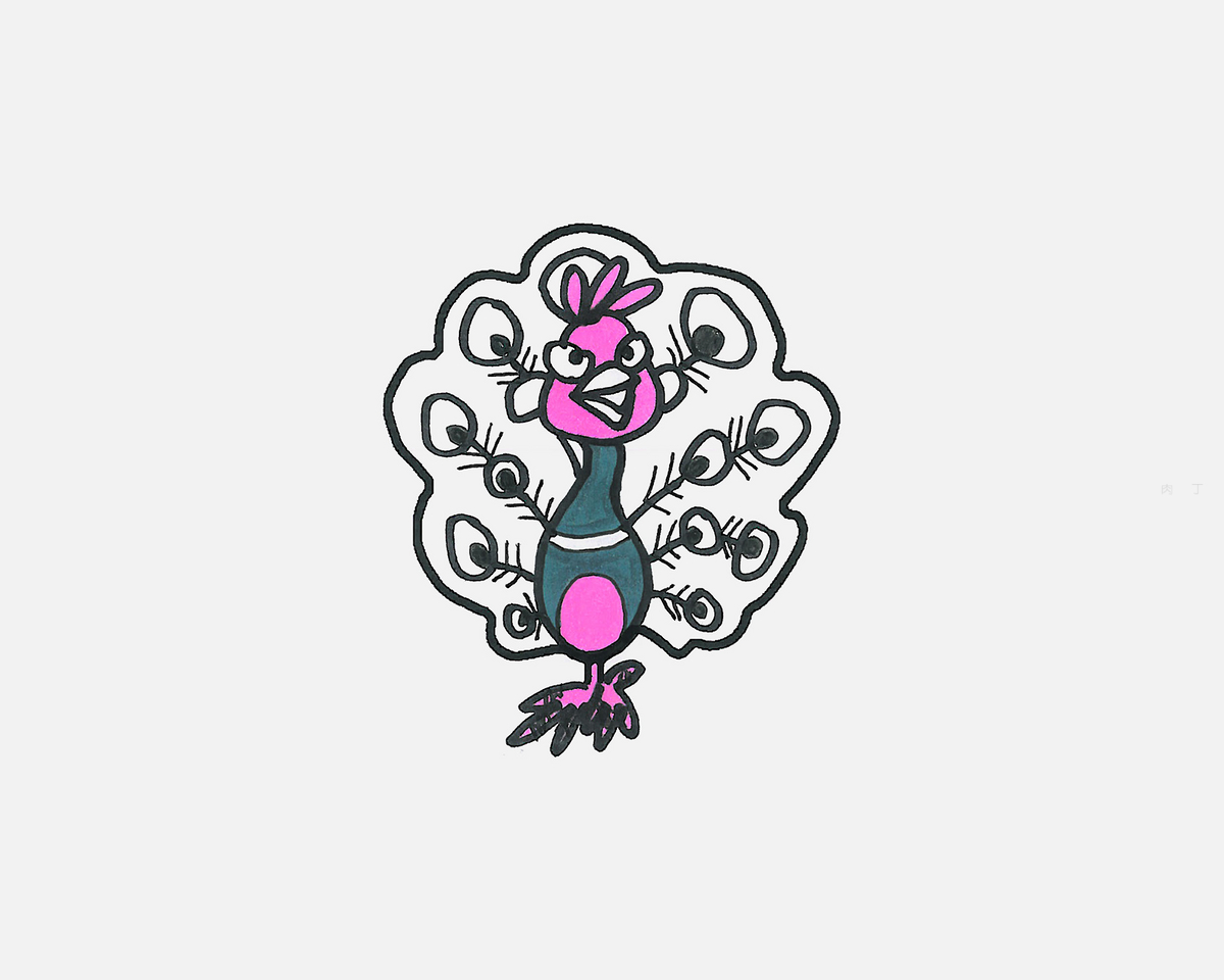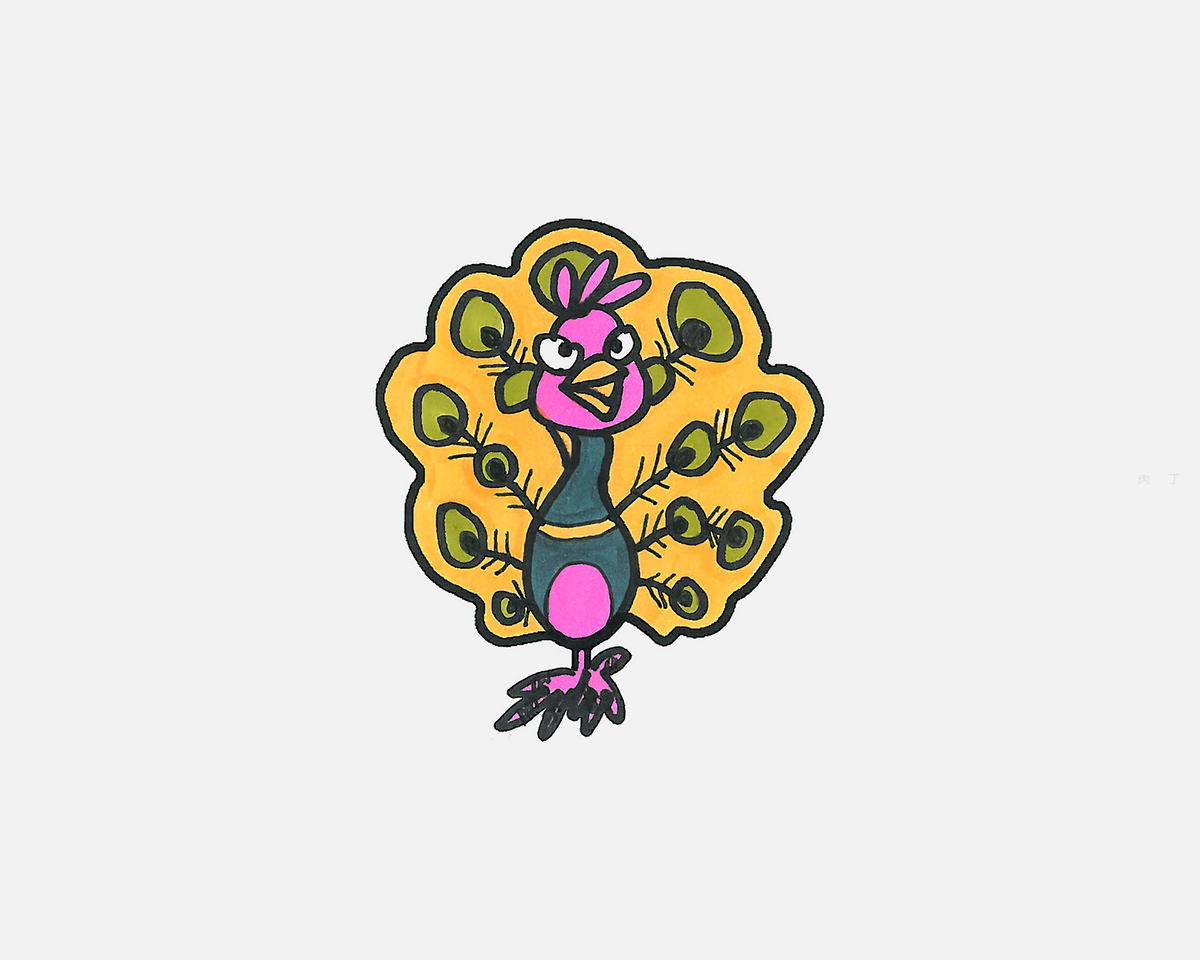 第5步、继续给孔雀涂细节色彩。这一篇孔雀画法就完成了,赶快自己动手试着画一画吧!你也可以试下打印上面的稿,自由填色哦。